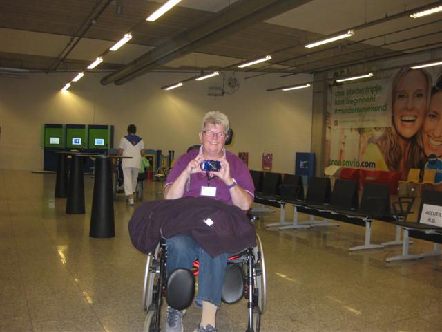 Rond 05.00u de begeleiding wakker gebeld om te helpen met mijn steunkousen en mij en mijn koffer naar beneden te helpen. We waren nog maar net beneden en toen stopte de taxi al. De chauffeur hielp met de koffer, handbagage en rolstoel en toen konden we op weg.