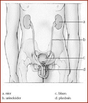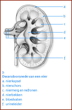 Ons lichaam produceert allerlei afvalstoffen. Deze afvalstoffen worden via het bloed afgevoerd naar onder meer de nieren. De nieren zijn twee boonvormige organen, die achter de buikholte liggen, aan weerszijden van de wervelkolom. Aan de buitenkant bevindt zich een stevig omhulsel: het nierkapsel. Daaronder liggen de nierschors en het niermerg. In het niermerg bevinden zich ongeveer een miljoen kleine filtertjes: de nefronen. Het bloed stroomt permanent door de nefronen en wordt op die manier gereinigd: de afvalstoffen blijven achter in de vorm van urine. De urine komt via hetnierbekken en de urineleiders in de blaas terecht. De nieren vormen samen met de urineleiders, deblaas en de plasbuis de urinewegen.